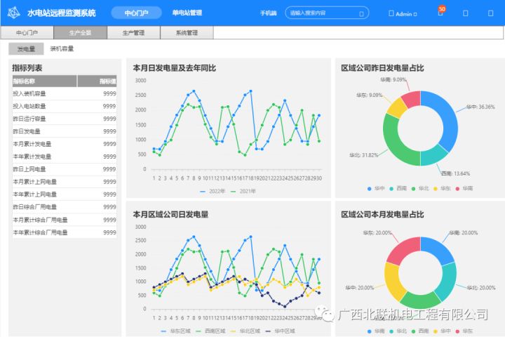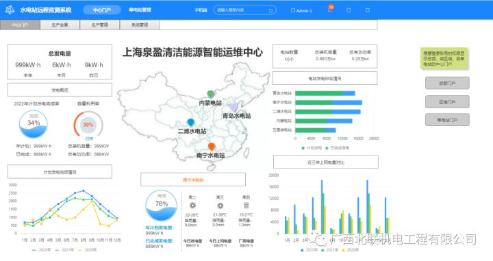 水電站分布位置、總發(fā)電量、計(jì)劃發(fā)電完成率、電站發(fā)電排名情況、電量對(duì)比等。